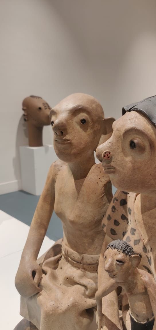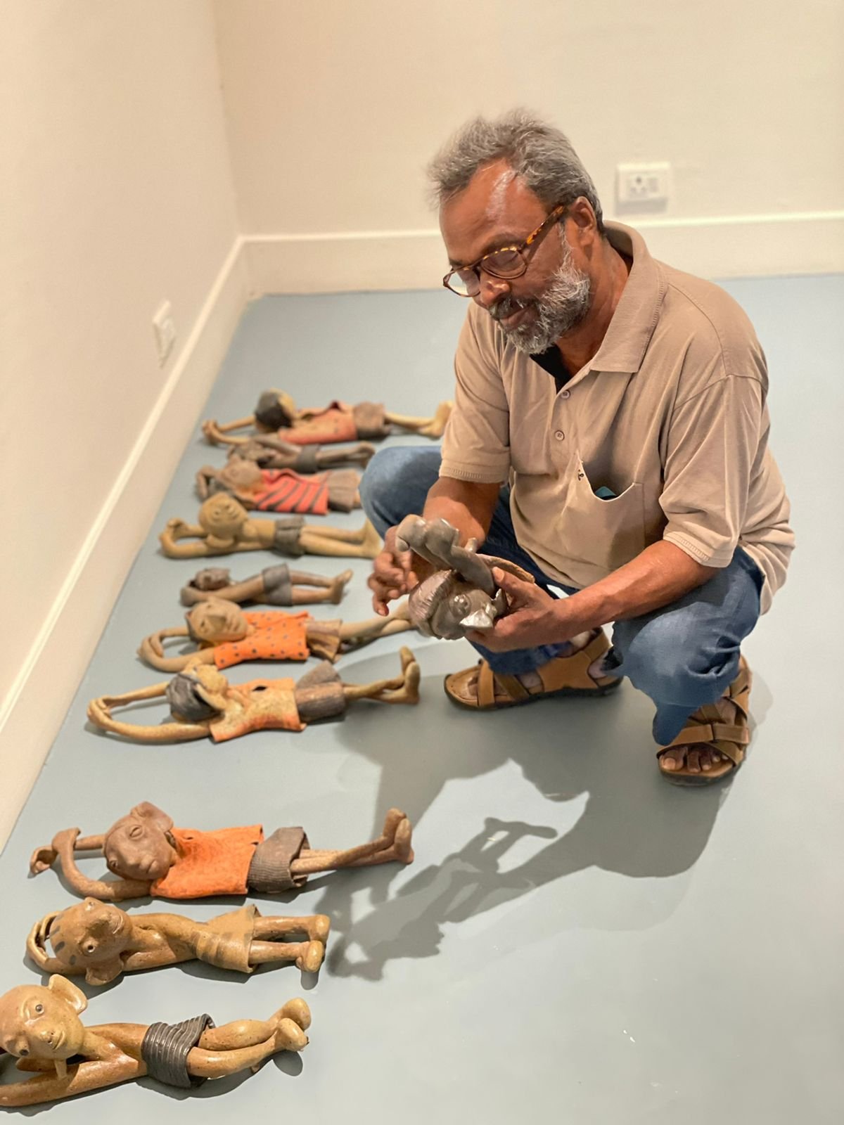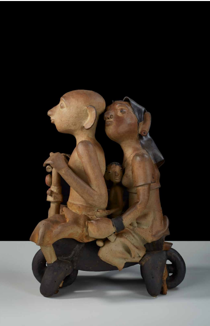 His figures immediately recall the simplicity of central India’s powerful terracotta votive figures. Without using textures or glaze, Reghu allows the clay to narrate an entire story of a life and its emotional memories that are summed up in his sparse compositions of human figures and objects that reveal a gamut of human energy and emotion. Reghu shows process through traces of the artist’s hand, fired into permanence through the medium of his kiln. He treats the body between space and time – as the intermediary between the immaterial and material world. The vitality of Reghu’s work lies in how perception creates space and meaning and formulates reality.